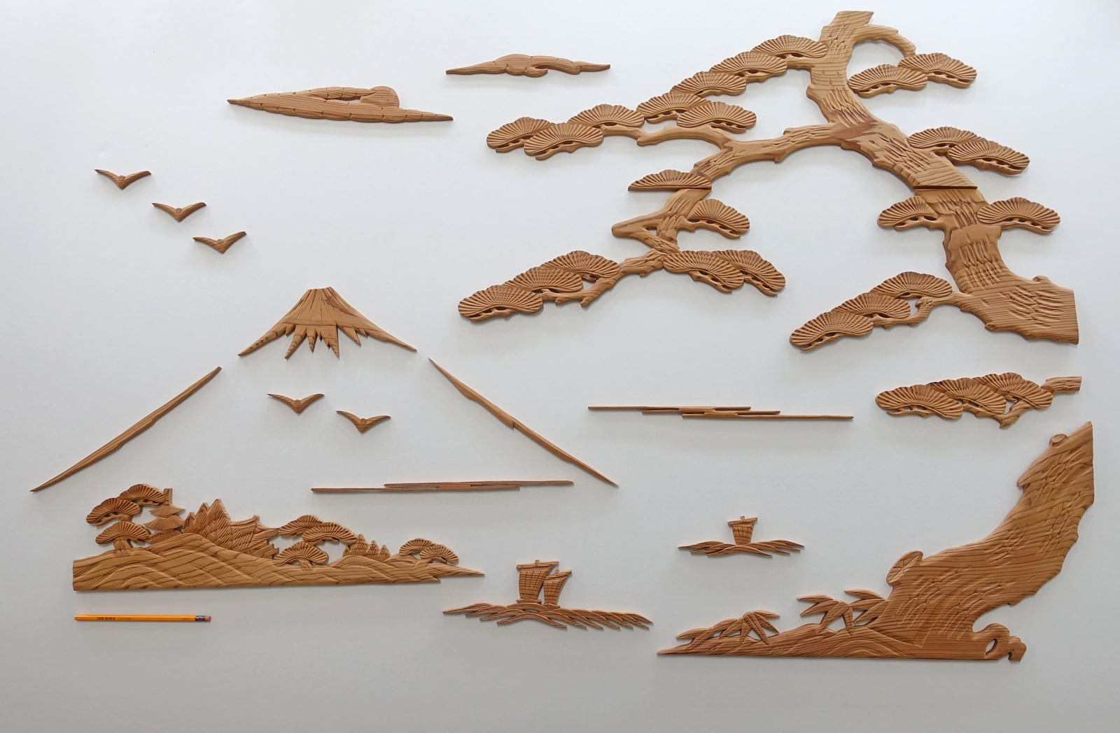 立派な富士山と縁起の良い松の木をメインに波に乗った船などが彫刻されています。松の木の木目や反りや、波が強い様子が忠実に再現されています。